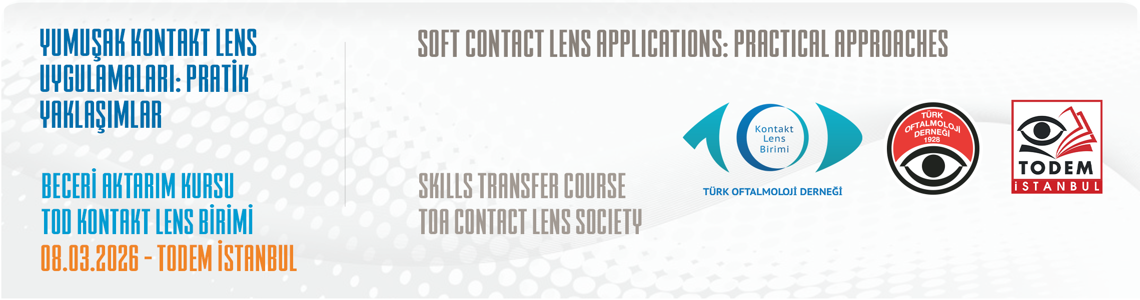 Türk Oftalmoloji Derneği Kontakt Lens Birimi’nin 2026 yılı ilk Beceri Aktarım Kursu olan “Yumuşak kontakt lens uygulamaları: Pratik yaklaşımlar” başlıklı kursumuz 8 Mart 2026 Pazar günü saat 10.00-14.30 arasında TODEM İstanbul’da gerçekleşecektir. Kurs programında öncelikle sferik ve torik yumuşak kontakt lens uygulamaları, ardından multifokal, son olarak da terapötik yumuşak kontakt lens uygulamalarının önemli ipuçları deneyimli eğitmenlerce anlatılacak; ardından katılımcılar 4 gruba ayrılarak farklı odalarda her lens tipi için olgu uygulamaları üzerinde tartışacaktır. Kontakt lens uygulamaları konusunda deneyim edinmek isteyen tüm katılımcılarımız için çok değerli fırsat olacağını düşünüyoruz.
