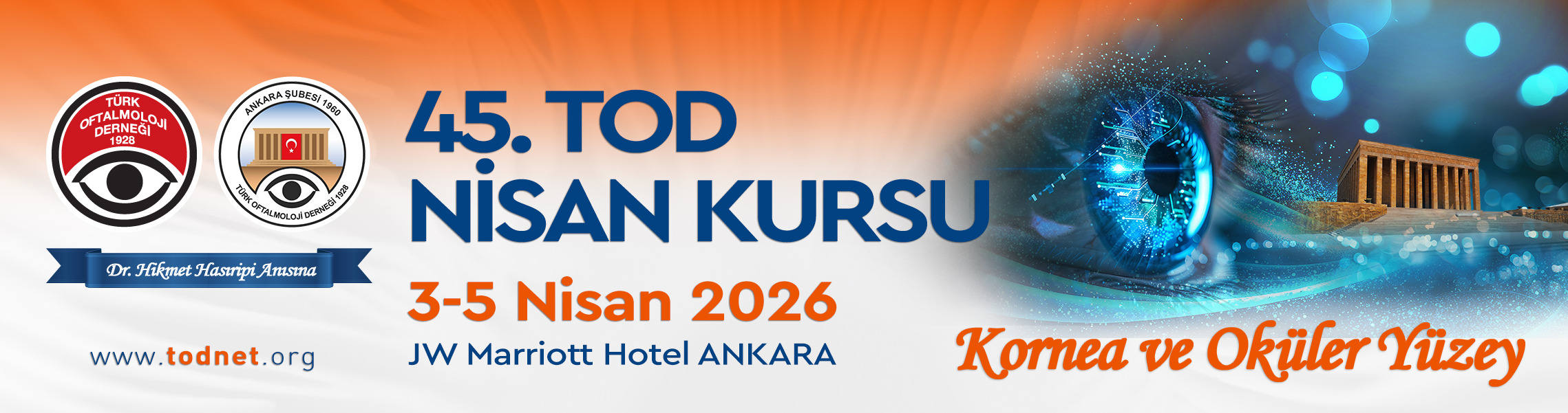 Ana konusu “Kornea ve Oküler Yüzey” olan 45. Nisan Kursu, 3-5 Nisan 2026 tarihleri arasında, geçen yıl olduğu gibi bu yıl da JW Marriott Ankara Otel’inde gerçekleştirilecektir. Bu yılki Nisan Kursumuz kısa bir süre önce aramızdan ayrılan merhum Dr. Hikmet Hasıripi anısına yapılacaktır.